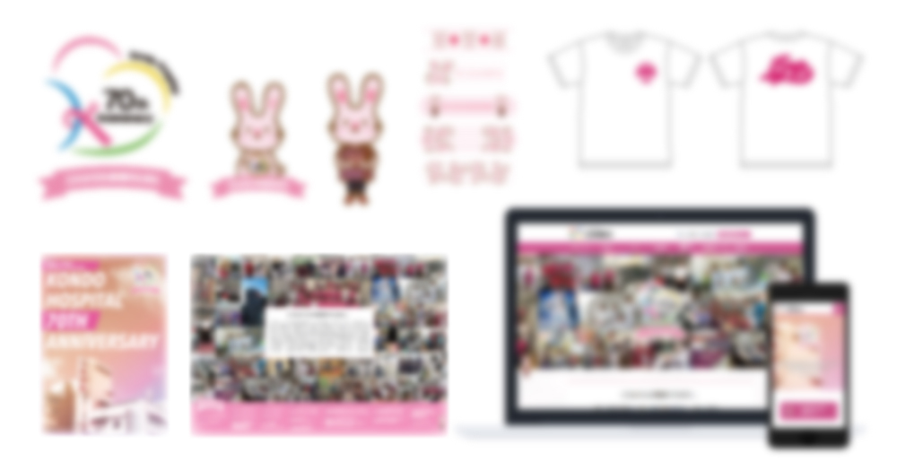 2020年に創業70周年を迎えられることから、約7ヶ月前から病院スタッフ様と合同で準備委員会を立ち上げ、事業コンセプトからご提案させていただきました。周年ロゴ、キャッチコピーをはじめ、院内全体で周年事業を盛り上げようと、キャラクターやネーミングはスタッフ様から募集、そのラフを元に弊社にてキャラクターを仕上げさせていただきました。ピンク色が病院カラーであること、地域に密着した病院であることを存分に盛り込み、周年事業を病院に関わる全ての方へ、感謝を届け、絆を強固にするチャンスになるよう、心をこめて広報誌やグッズを制作させていただきました。